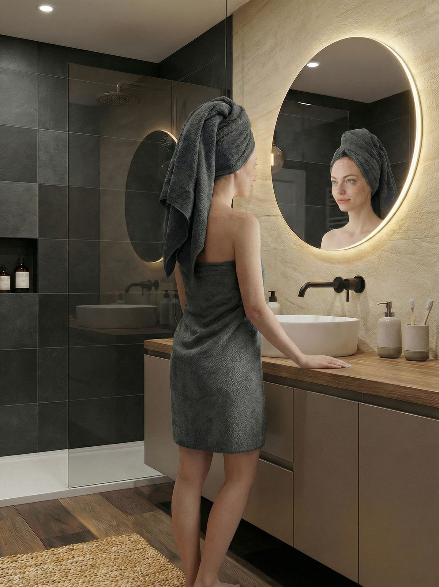Хорошо впитывает влагу, быстро сохнет и сохраняет тактильный комфорт даже при ежедневном использовании. Подходит для дома и премиальных интерьеров, где важны ощущение чистоты, спокойствия и качества.