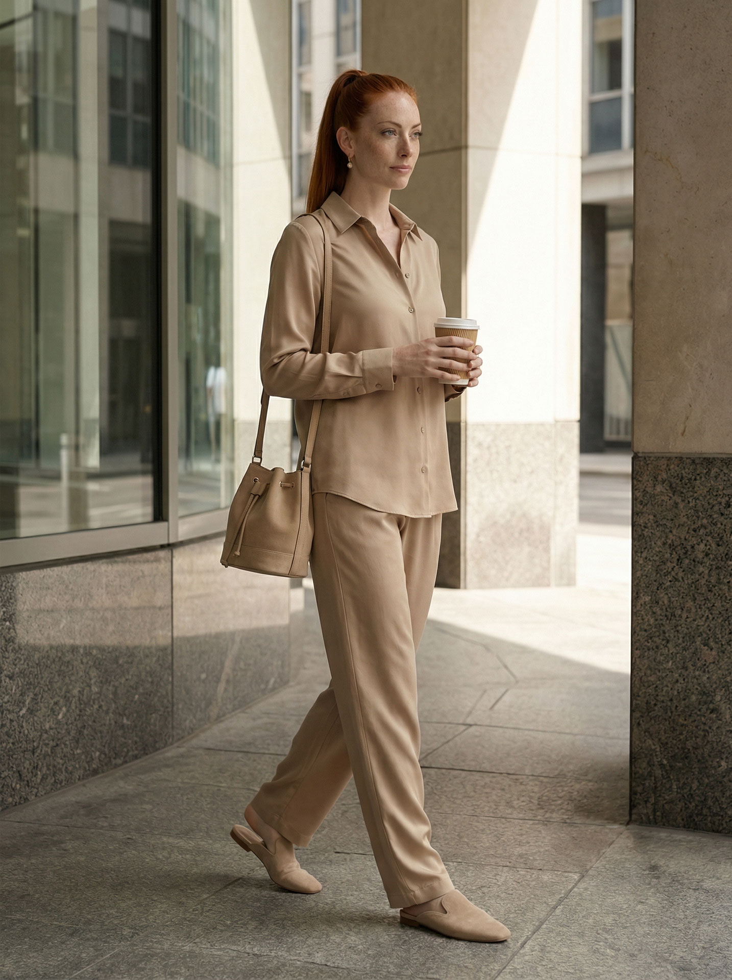 Пижама для города из шёлка или премиальной смесовой ткани. Комфорт домашней одежды и внешний вид, уместный за пределами дома. Лёгкая, практичная, однотонная.